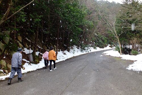 先週は家庭の都合でお休みしたので 今日は2週間ぶりの荒神山ウォーキングとなりました 登り始めるとすぐに 雪がちらついてきました でも 傘を差すほどのことはなく・・・ 歩く道は林道ですが 街中の道路と変わらず 雪は路肩に残っているだけでした大きな枯…